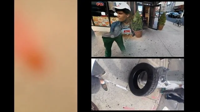 Smell of Red, Tire Action – Glasshouse Performance Space, New York, 2014 (1:30 minute loop). Single-channel version of a 3-channel video installation. Channel 1 (left), shown on iPhone – iPhone video with macro-lens, attached to car tire; tire/cinnamon print in reference to the Glasshouse exhibition, ‘Weather Patterns, Smell of Red’, with Erin Manning and Nathaniel Stern. Channel 2 (top right), shown on Nexus 4 – Nexus 3D sphere, video navigation screen capture; car tire action with local passersby. Channel 3 (bottom right) shown on Samsung tablet – street action with GoPro attached to car tire.